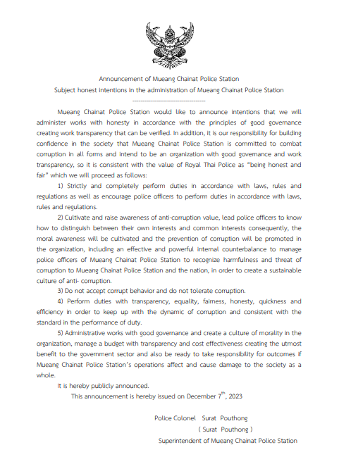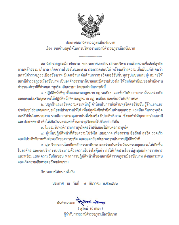 เรื่อง เจตจำนงสุจริตในการบริหารงานสถานีตำรวจภูธรเมืองชัยนาท 7 ธันวาคม 2566 โดย admin@tu / การมีส่วนร่วมหัวหน้าหน่วย,ข่าวประชาสัมพันธ์ จำนวนผู้เข้าชม : 318 FacebookFacebookXXLINELine