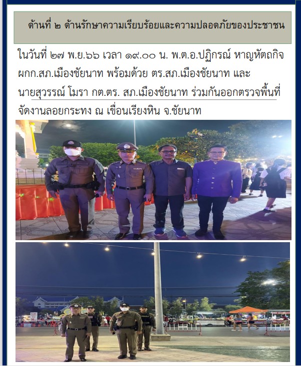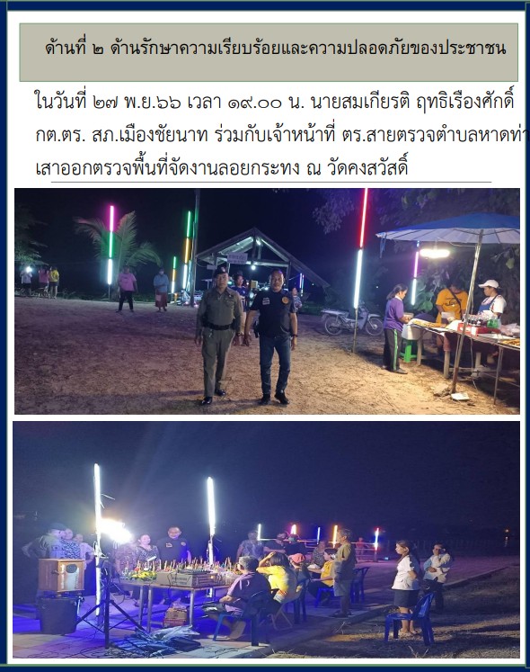ในวันที่ 27 พ.ย.66 เวลา 19.00 น. นายสมเกียรติ ฤทธิเรืองศักดิ์ กต.ตร. สภ.เมืองชัยนาท ร่วมกับเจ้าหน้าที่ ตร.สายตรวจตำบลหาดท่าเสาออกตรวจพื้นที่จัดงานลอยกระทง ณ วัดคงสวัสดิ์