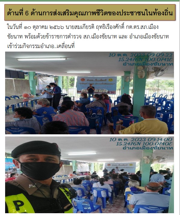 ในวันที่ 10 ตุลาคม 2566 นายสมเกียรติ ฤทธิเรืองศักดิ์ กต.ตร.สภ.เมืองชัยนาท พร้อมด้วยข้าราชการตำรวจ สภ.เมืองชัยนาท และ อำเภอเมืองชัยนาทเข้าร่วมกิจกรรมอำเภอ..เคลื่อนที่