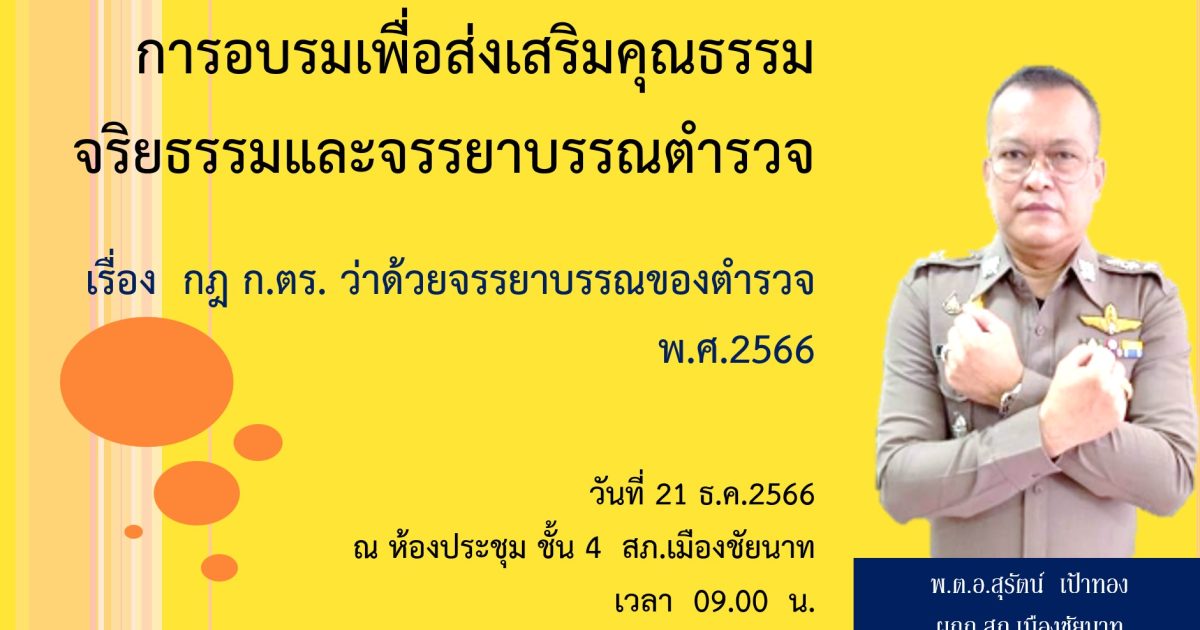 วันที่ ๒๑ ธ.ค.2566 เวลา 09.30 น. พ.ต.อ.สุรัตน์ เป้าทอง ผกก.สภ.เมืองชัยนาท จัดอบรมข้าราชการตำรวจในสังกัด เรื่อง ข้าราชการตำรวจพึงปฏิบัติตน เพื่อรักษาจริยธรรม ในการประชุมบริหารประจำเดือนของหน่วย