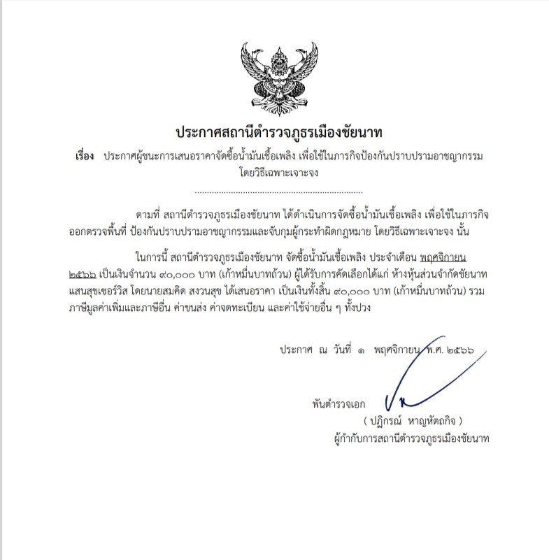 - ประกาศสถานีตำรวจภูธรเมืองชัยนาทเรื่อง ประกาศผู้ชนะการเสนอราคาจัดซื้อน้ำมันเชื้อเพลิง เพื่อใช้ในภารกิจป้องกันปราบปรามอาชญากรรม โดยวิธีเฉพาะเจาะจง เดือน พ.ย 66 pdf คลิกที่นี่