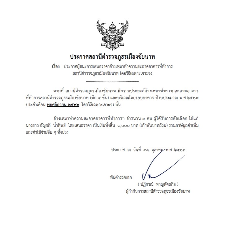 - ประกาศสถานีตำรวจภูธรเมืองชัยนาทเรื่อง ประกาศผู้ชนะการเสนอราคาจัดซื้อน้ำมันเชื้อเพลิง เพื่อใช้ในภารกิจป้องกันปราบปรามอาชญากรรม โดยวิธีเฉพาะเจาะจง เดือน พ.ย 66 pdf คลิกที่นี่
