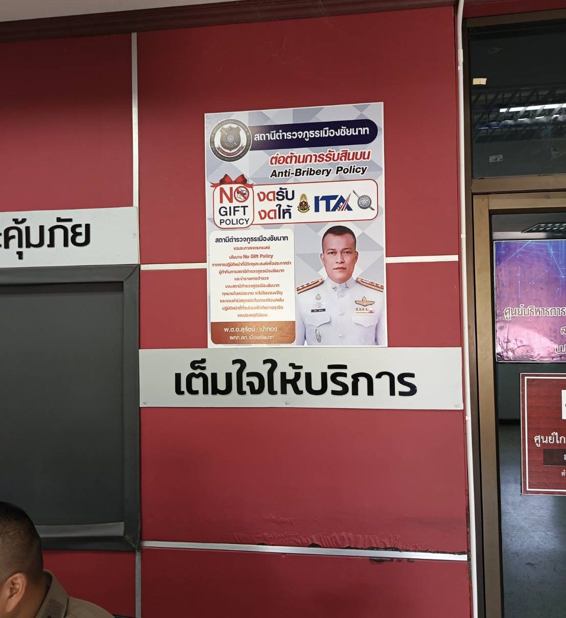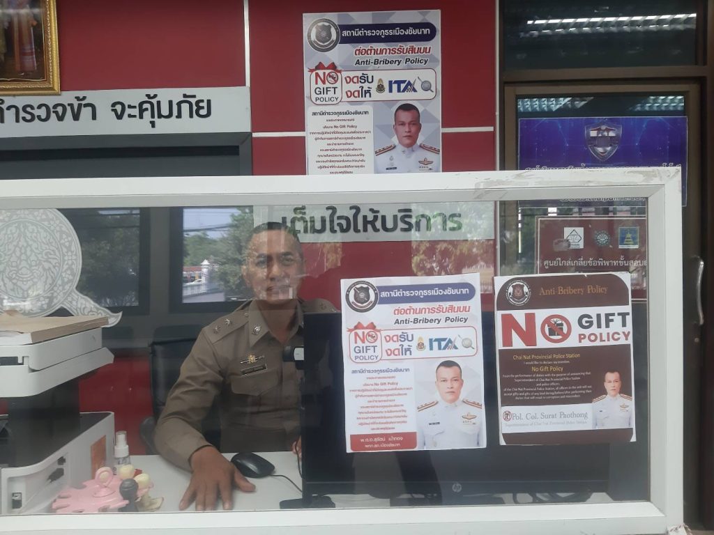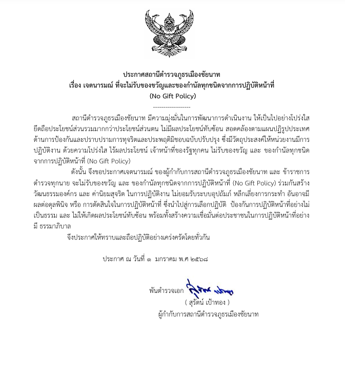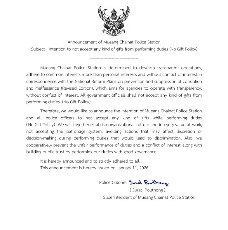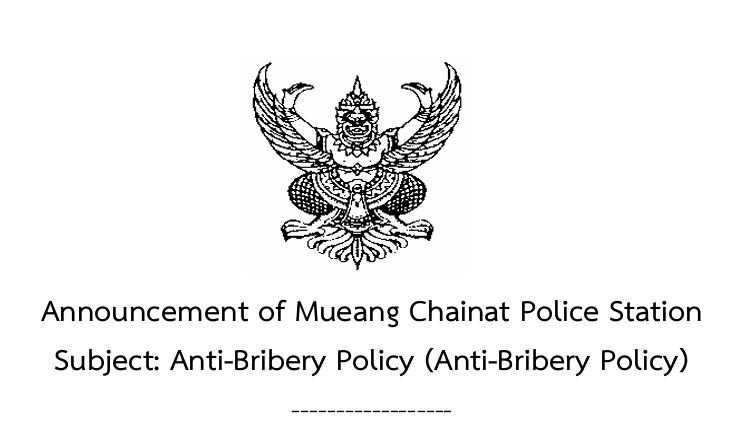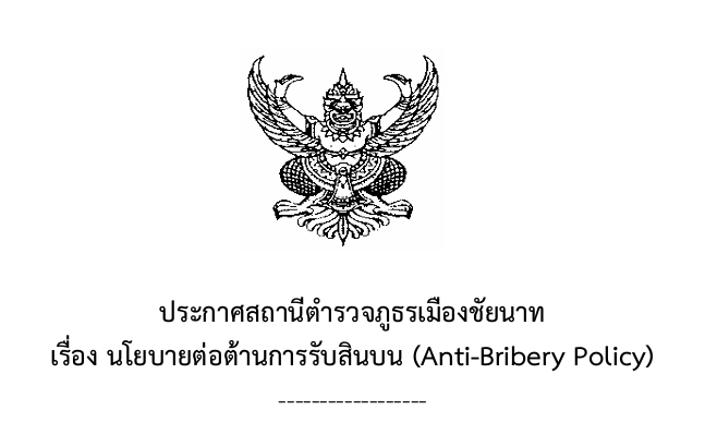♥ แสดงประกาศนโยบายการต่อต้านการรับสินบน (Anti-Bribery Policy) โดยหัวหน้าสถานีตำรวจคนปัจจุบัน ในปีงบประมาณ พ.ศ. 2569 และให้เผยแพร่เป็นภาษาไทยและภาษาอังกฤษ
