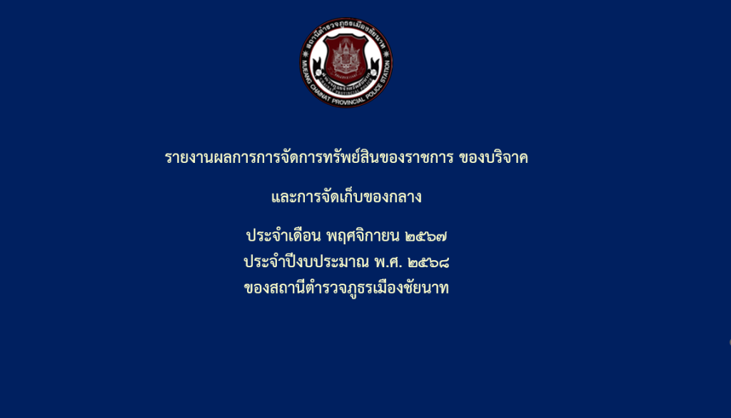 รายงานผลการการจัดการทรัพย์สินของราชการ ของบริจาค และการจัดเก็บของกลาง ประจำเดือน พฤศจิกายน 2567 ประจำปีงบประมาณ พ.ศ.68ของสถานีตำรวจภูธรเมืองชัยนาท