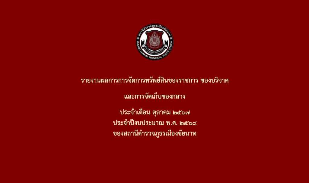 รายงานผลการการจัดการทรัพย์สินของราชการ ของบริจาค และการจัดเก็บของกลาง ประจำเดือน ตุลาคม 2567 ประจำปีงบประมาณ พ.ศ. 2568 ของสถานีตำรวจภูธรเมืองชัยนาท