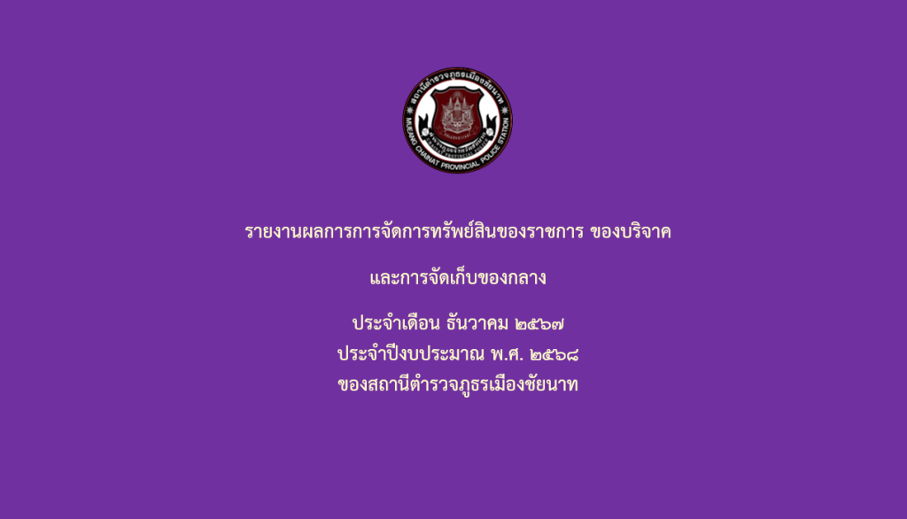 รายงานผลการการจัดการทรัพย์สินของราชการ ของบริจาค และการจัดเก็บของกลาง ประจำเดือน ธันวาคม 2567 ประจำปีงบประมาณ พ.ศ. 2568 ของสถานีตำรวจภูธรเมืองชัยนาท