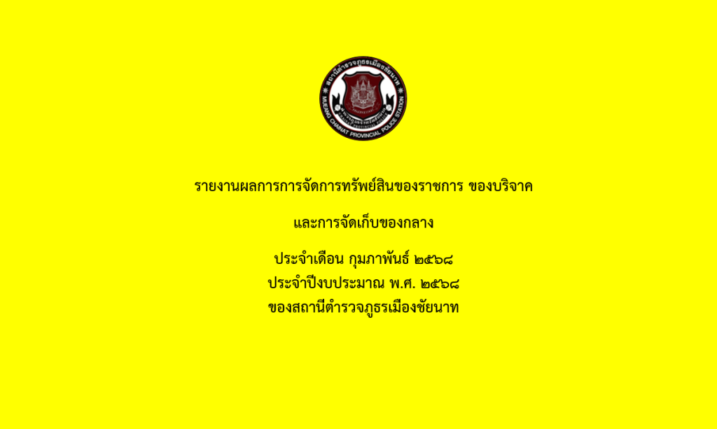 รายงานผลการการจัดการทรัพย์สินของราชการ ของบริจาค และการจัดเก็บของกลาง ประจำเดือน กุมภาพันธ์ 2568 ประจำปีงบประมาณ พ.ศ. 2568ของสถานีตำรวจภูธรเมืองชัยนาท