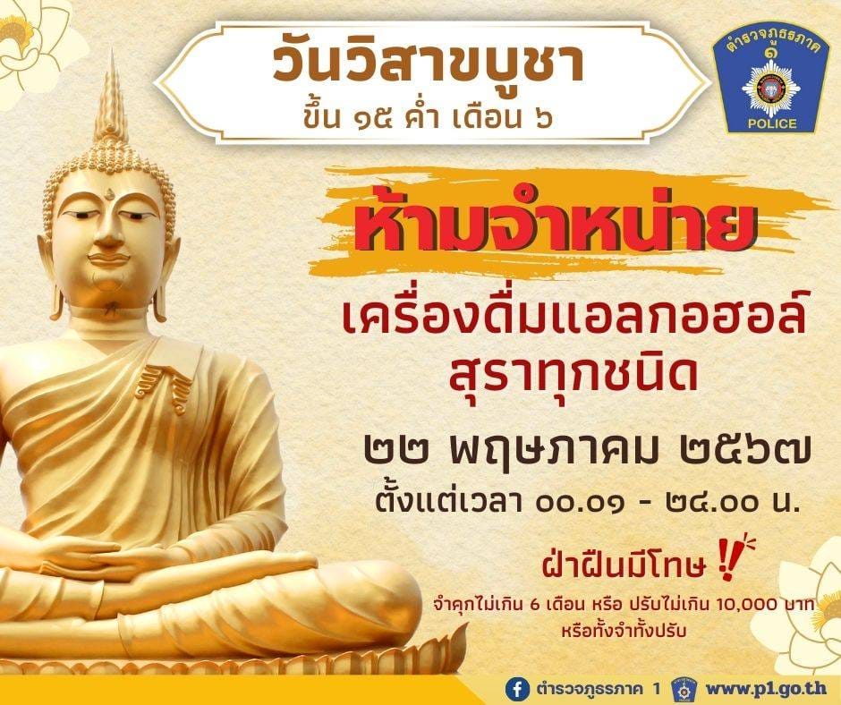 ห้ามขายเครื่องดื่มแอลกอฮอล์ทุกชนิด เนื่องในวันสำคัญทางศาสนา “วันวิสาขบูชา” 22 พฤษภาคมนี้