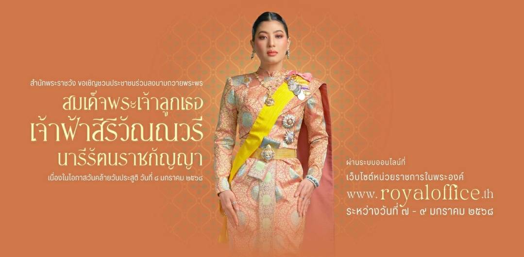 ขอเชิญชวนประชาชนร่วมลงนามถวายพระพร สมเด็จพระเจ้าลูกเธอ เจ้าฟ้าสิริวัณณวรี นารีรัตนราชกัญญา เนื่องในโอกาสวันคล้ายวันประสูติ วันที่ ๘ มกราคม ๒๕๖๘